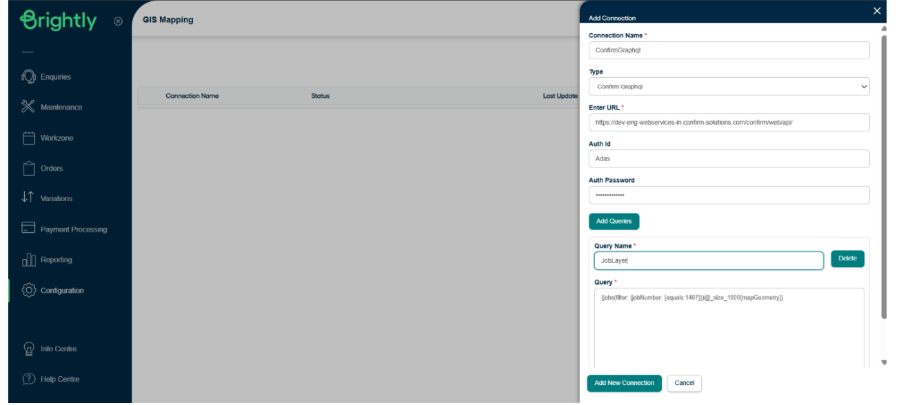 Go to the GIS Mapping screen and click on Add Connection. Fill in the following details: