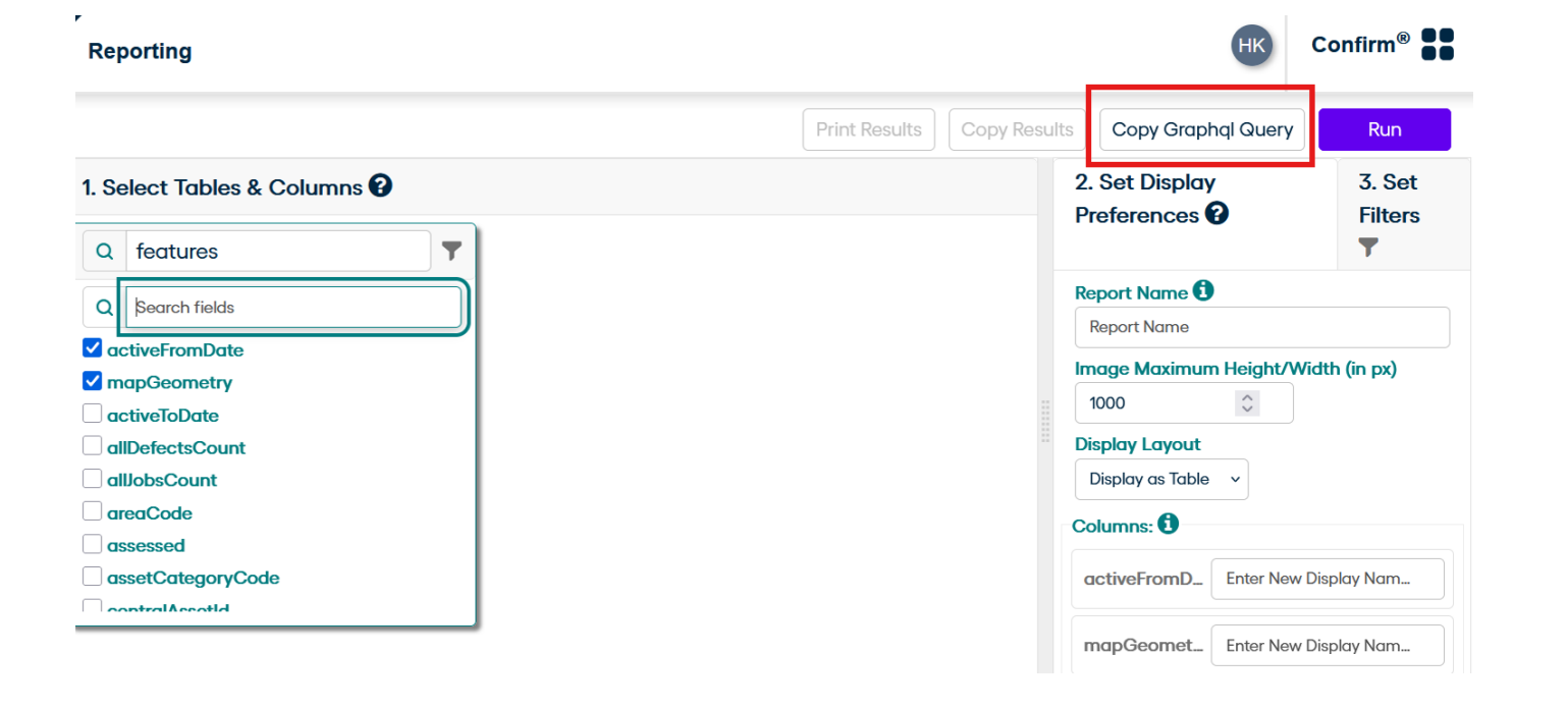 Navigate to the Reporting section in Confirm. Use the UI to request the data you need. Once the data is displayed, click the Copy GraphQL button. A message will appear: Copied to Clipboard - this confirms your query is ready to use.