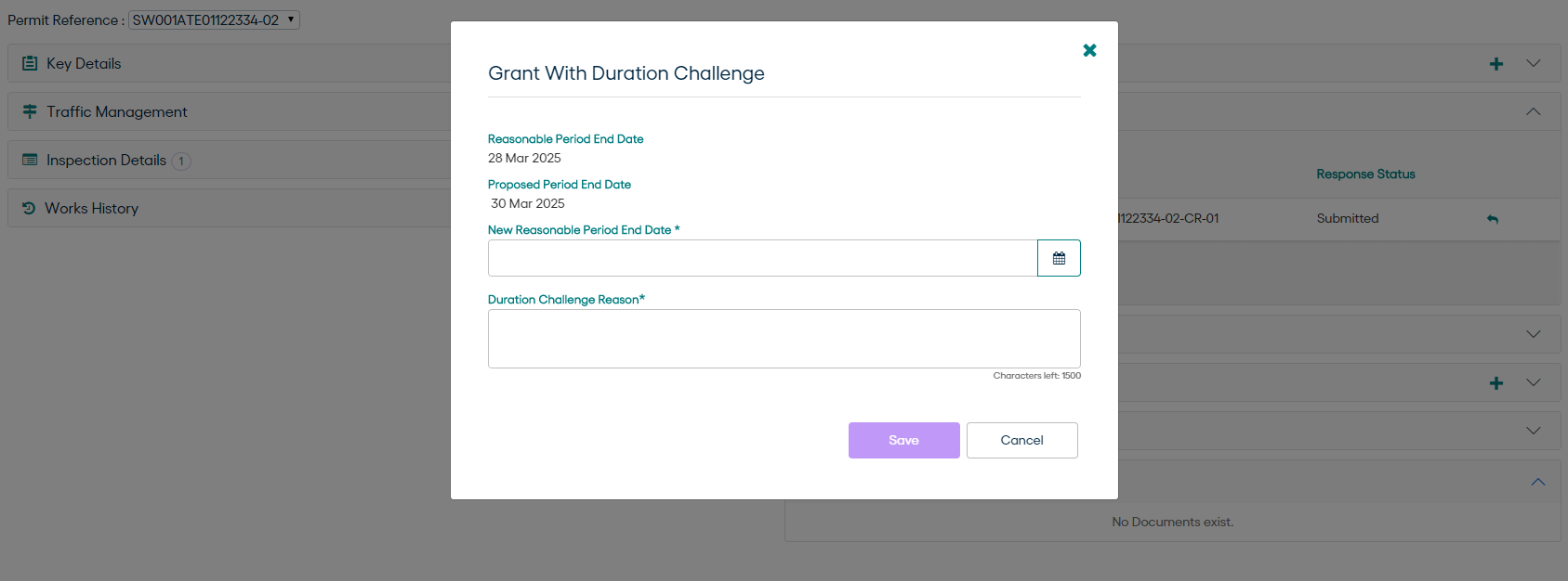 A Duration Challenge can be further responded by Authority by clicking on the Response icon to provide a 'New Reasonable Period End Date' with its Reason on Grant with Duration Challenge Modal window.