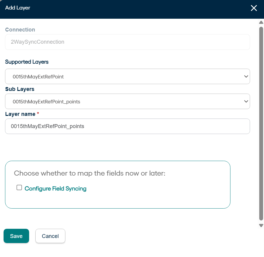 Begin adding layers by clicking on Add Layer button present in the tab for one’s respective connection. In this case, it will be the button in front of Connection_2waysync.