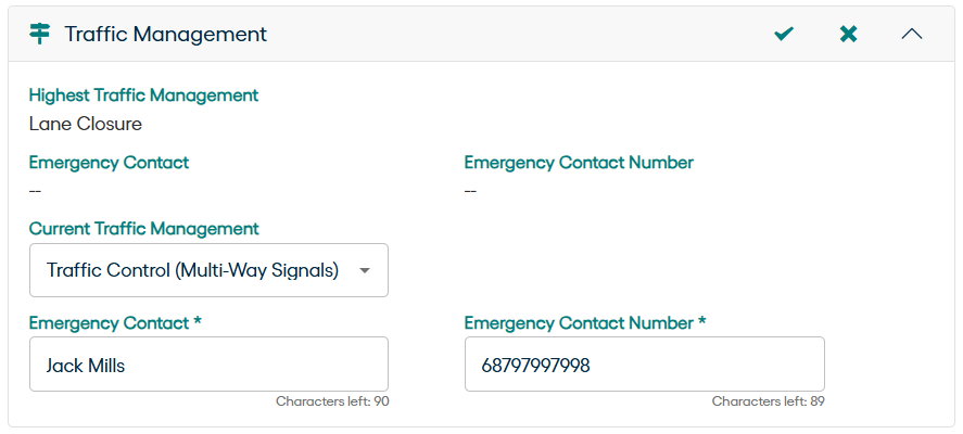Note: For Current Traffic Management as Traffic Control (Multi-Way Signals) and Traffic Control (Two-Way Signals), Emergency Contact and Emergency Contact Number is enabled and a mandatory field.